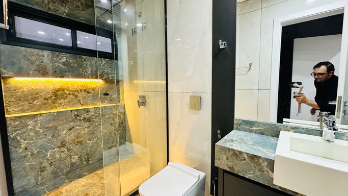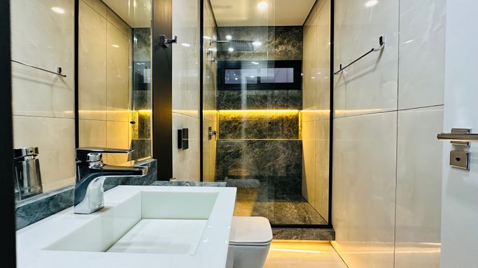 Mas não para por aí! 🛁 Cada banheiro nas suítes é um verdadeiro tesouro, decorado com acabamentos de alta qualidade e metais sofisticados. 🚰🌹 Você vai se sentir em um verdadeiro spa cinco estrelas!