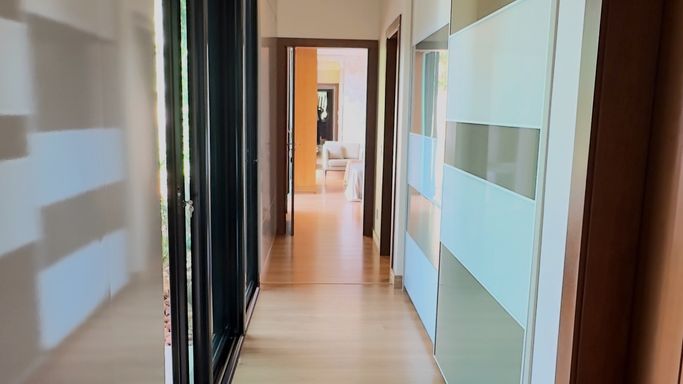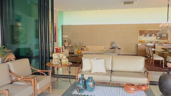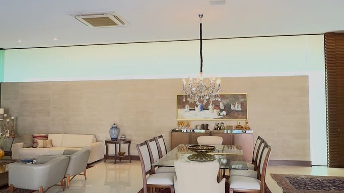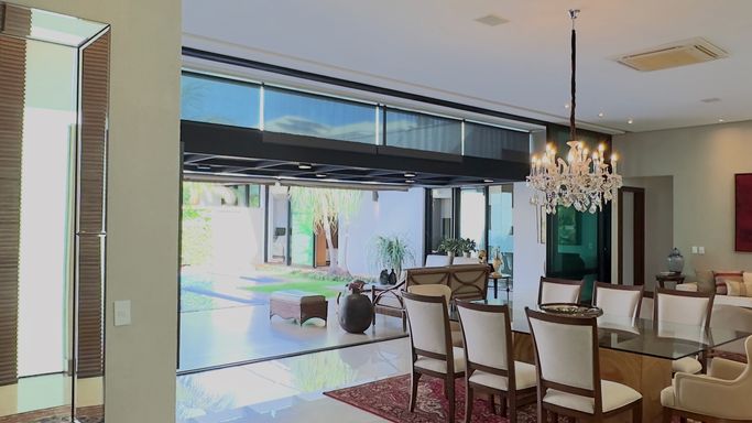 Ao entrar, o pé-direito elevado valoriza a sensação de amplitude e revela um living integrado com esquadrias amplas, que trazem luz natural abundante e conexão direta com a área externa. O piso em porcelanato premium, a marcenaria sob medida e o projeto de iluminação reforçam o equilíbrio entre estética e funcionalidade.