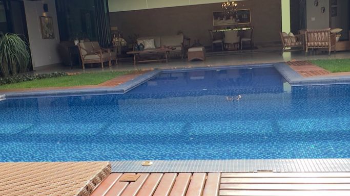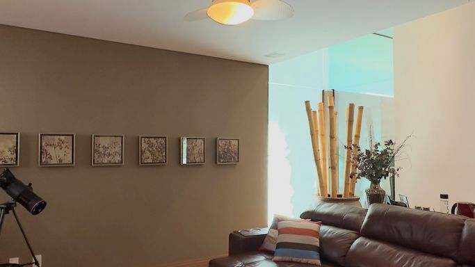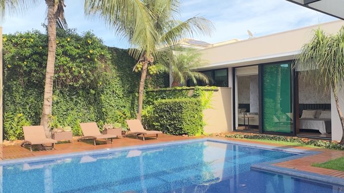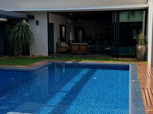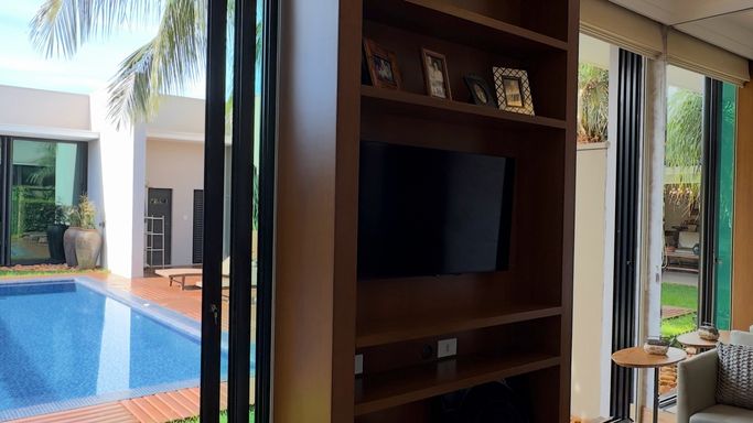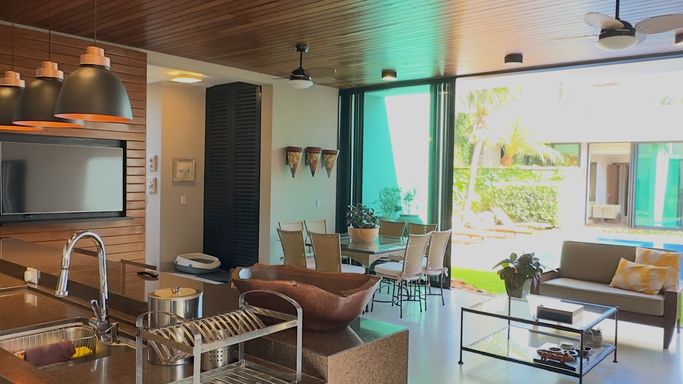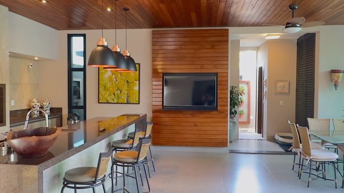 Além disso, a casa dispõe de um Home Theater exclusivo, um ambiente especialmente projetado para entretenimento, equipado com sistema de som integrado, tanto no próprio espaço quanto conectado à sala de estar principal, permitindo uma experiência acústica contínua e envolvente. O ambiente é complementado por um deck elegante, que amplia a área de convivência e cria um cenário perfeito para momentos de cinema e descontração.