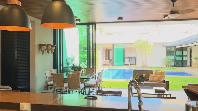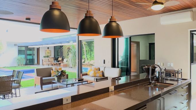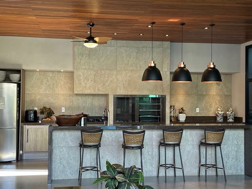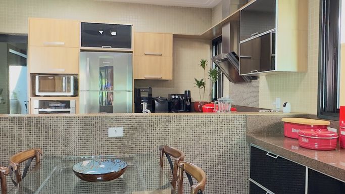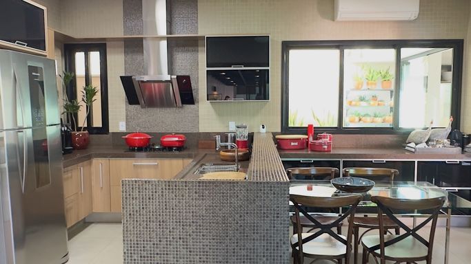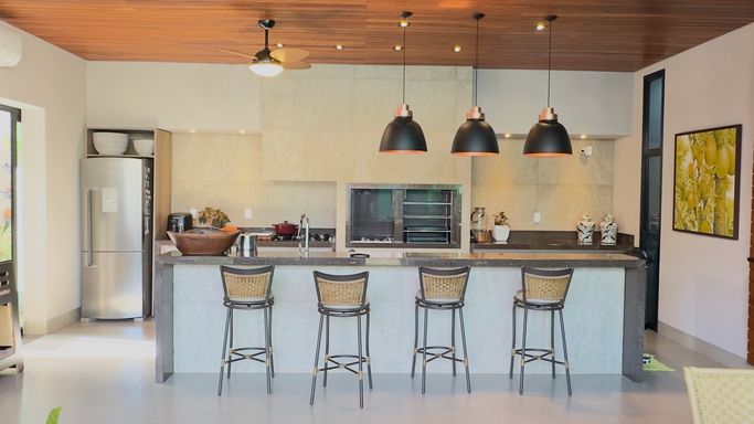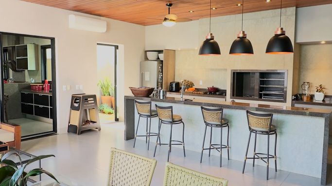 A cozinha gourmet, posicionada de forma estratégica, integra-se com naturalidade ao estar e à área de lazer, criando um eixo de convivência perfeito para receber. O espaço conta com eletrodomésticos de alto padrão, bancadas generosas e um layout pensado para fluxo e ergonomia.